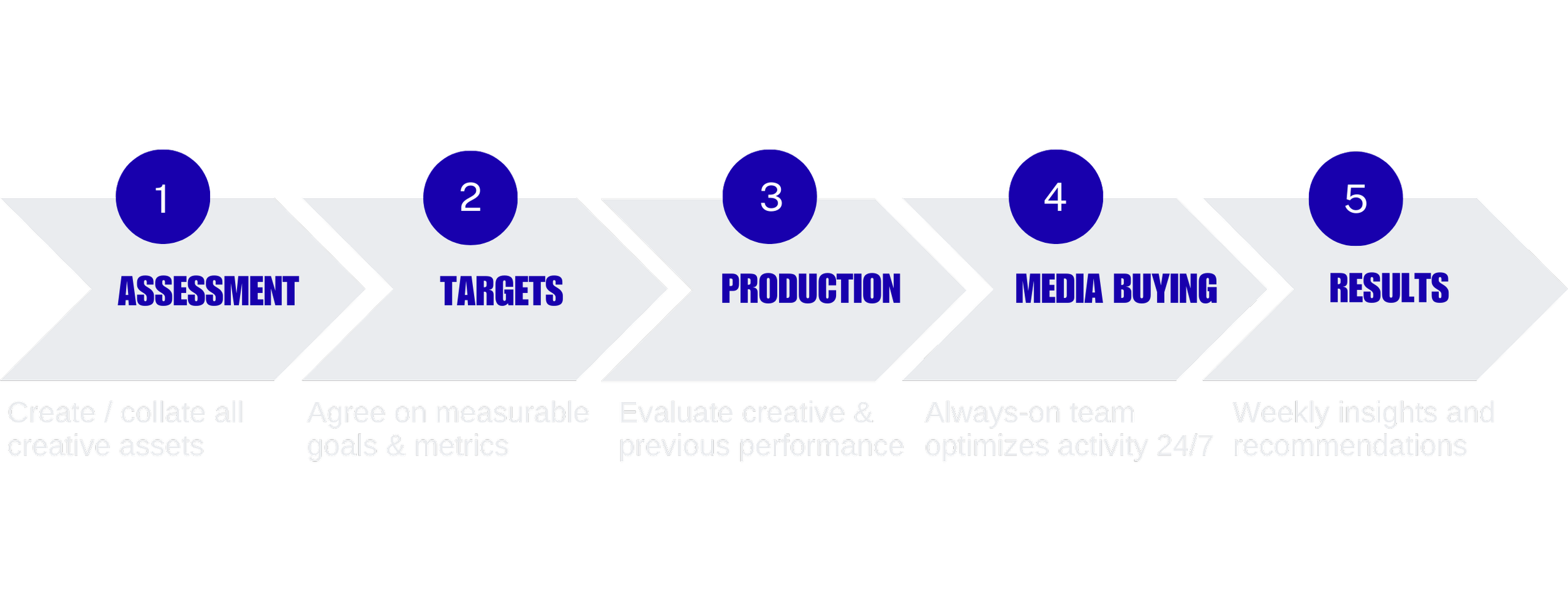 Strategy, production, and media buying - with a guaranteed 10% performance lift over your previous spend.